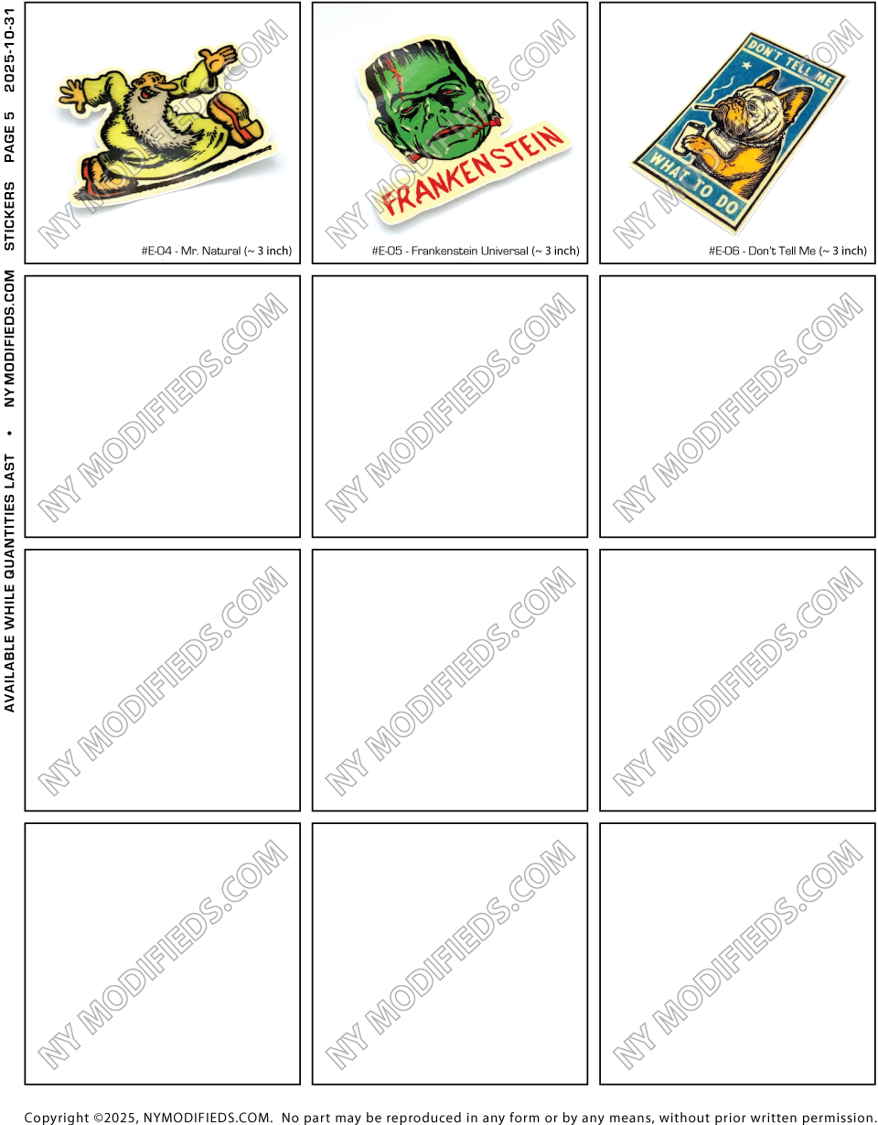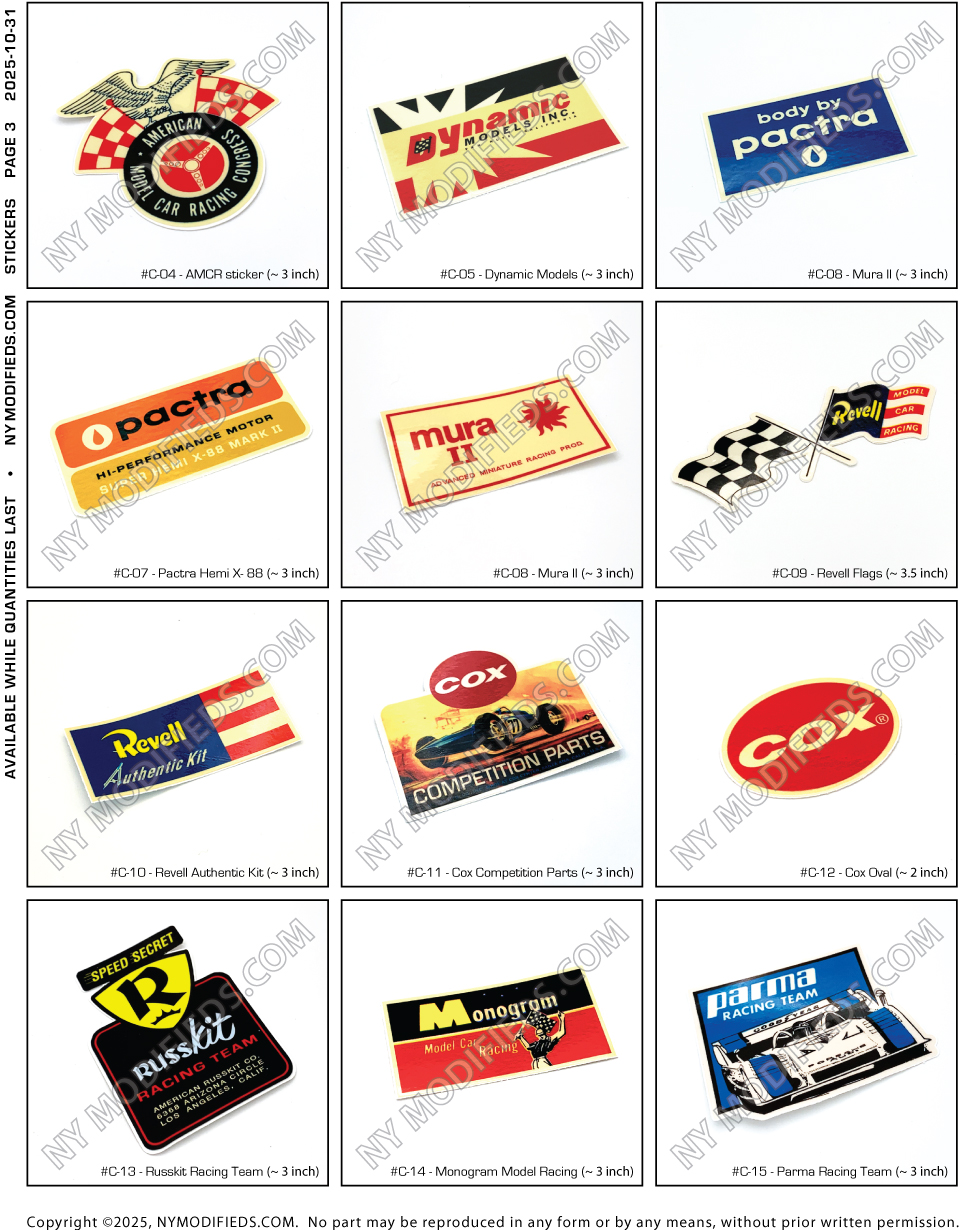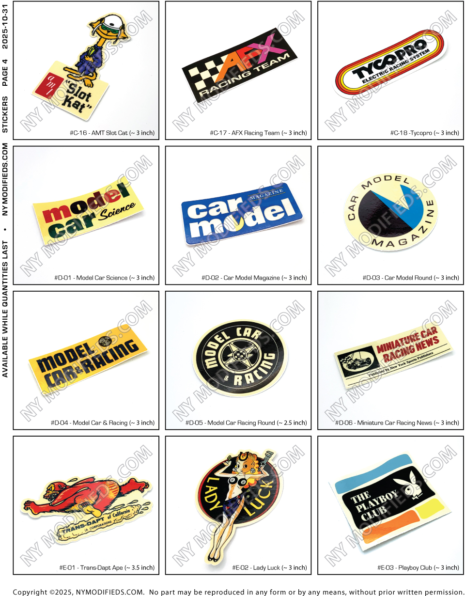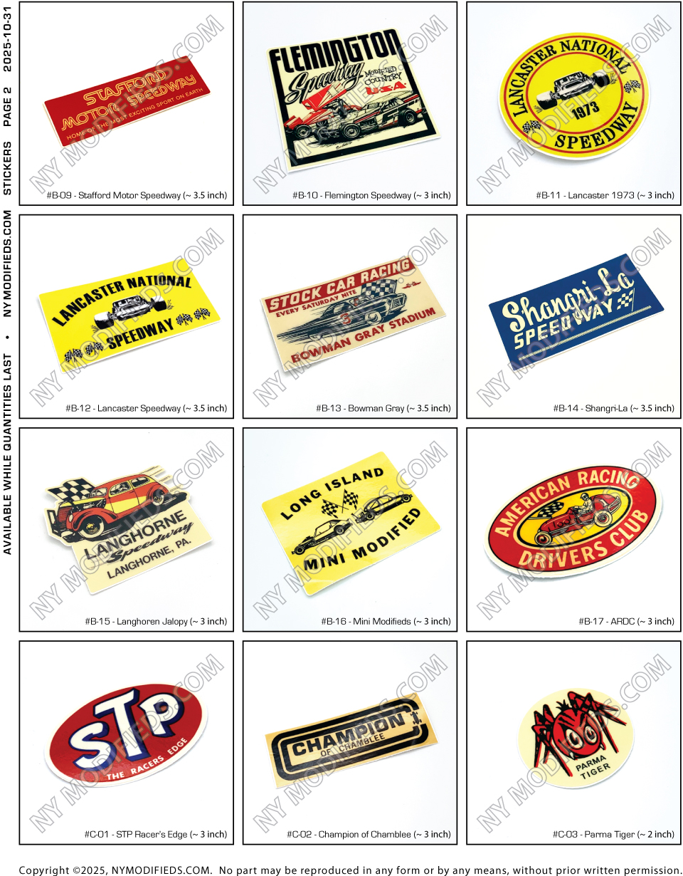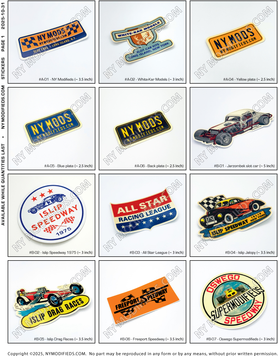 Lots of stickers – mostly vintage style; from current subjects to great stickers from the past. There are over fifty (50+) stickers available as shown on the NY Modifieds Sticker Lists below. If you would like a favorite sticker from the past, let me know, or if you need something else, we might just have what you need!